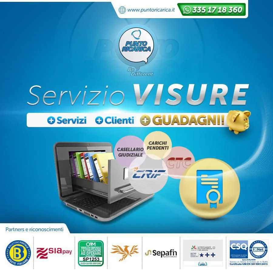 Nei punti vendita Puntoricarica , grazia alla patnership con azienda leader del settore , si potranno ottenere immediatamente le Visure Registri Imprese (le cosiddette Visure Camerali Ordinarie e Storiche integrate nella COMPANY CARD) e le Visure Protesti, le Visure Pregiudizievoli, Crif Business Information, richiedere copia Atti e Bilanci Società ecc..